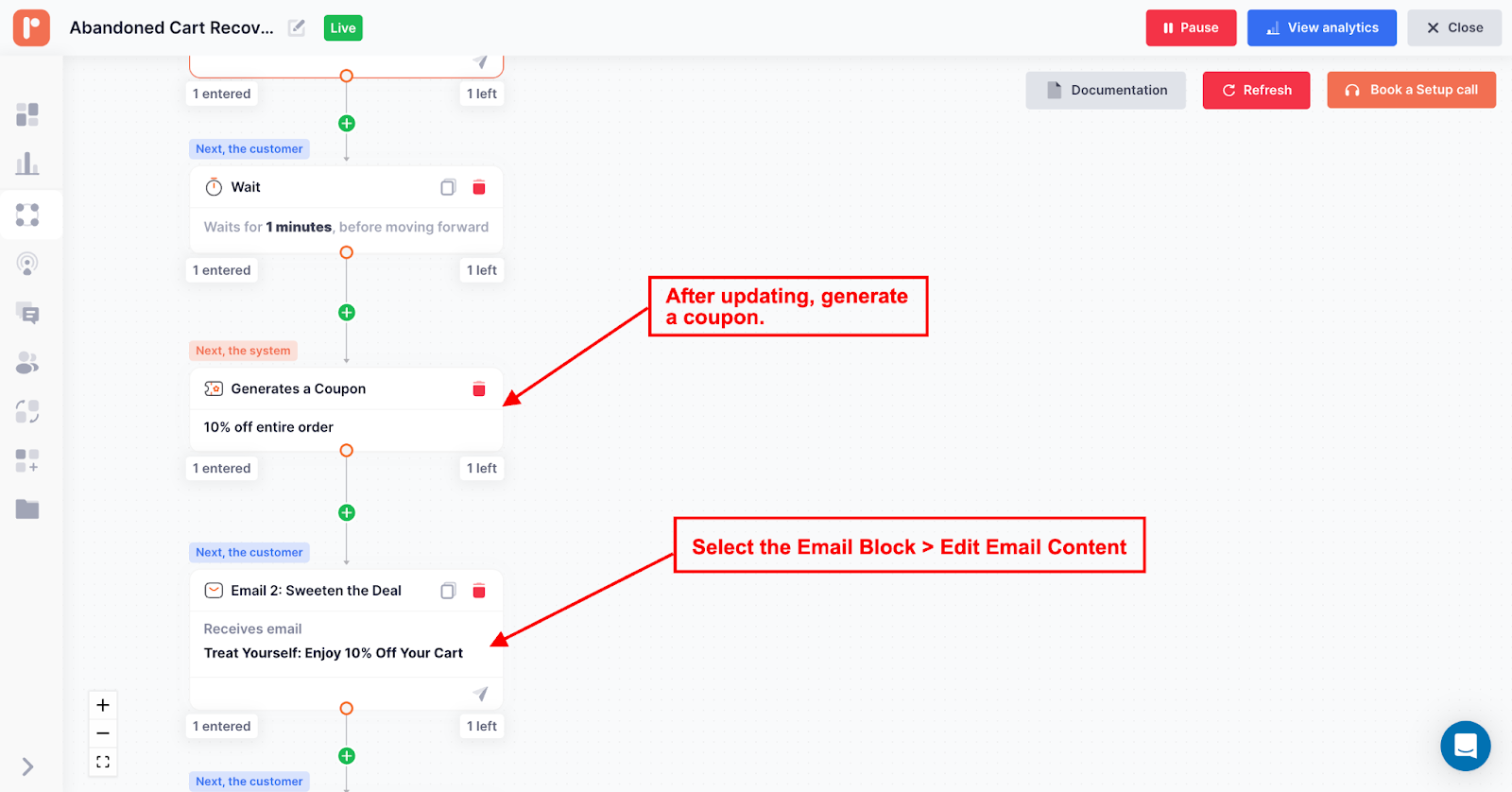 To configure coupon codes in an email template, start by adding a coupon block element within the automation workflow.