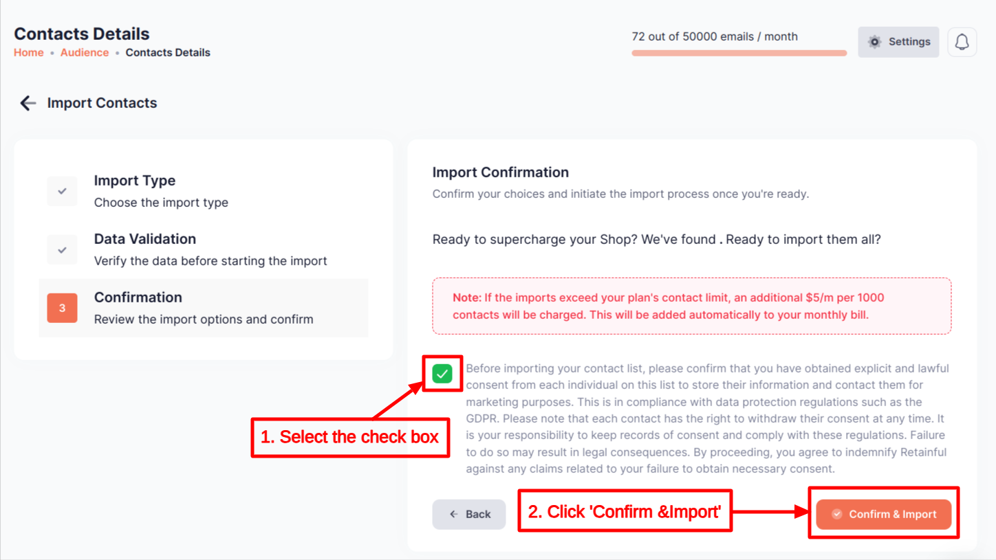 **Step 4:** Now, a prompt will appear; Select the checkbox to accept the policy of GDPR compliance then Click on the 'confirm & Import' button in the prompt to proceed.